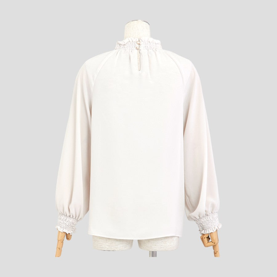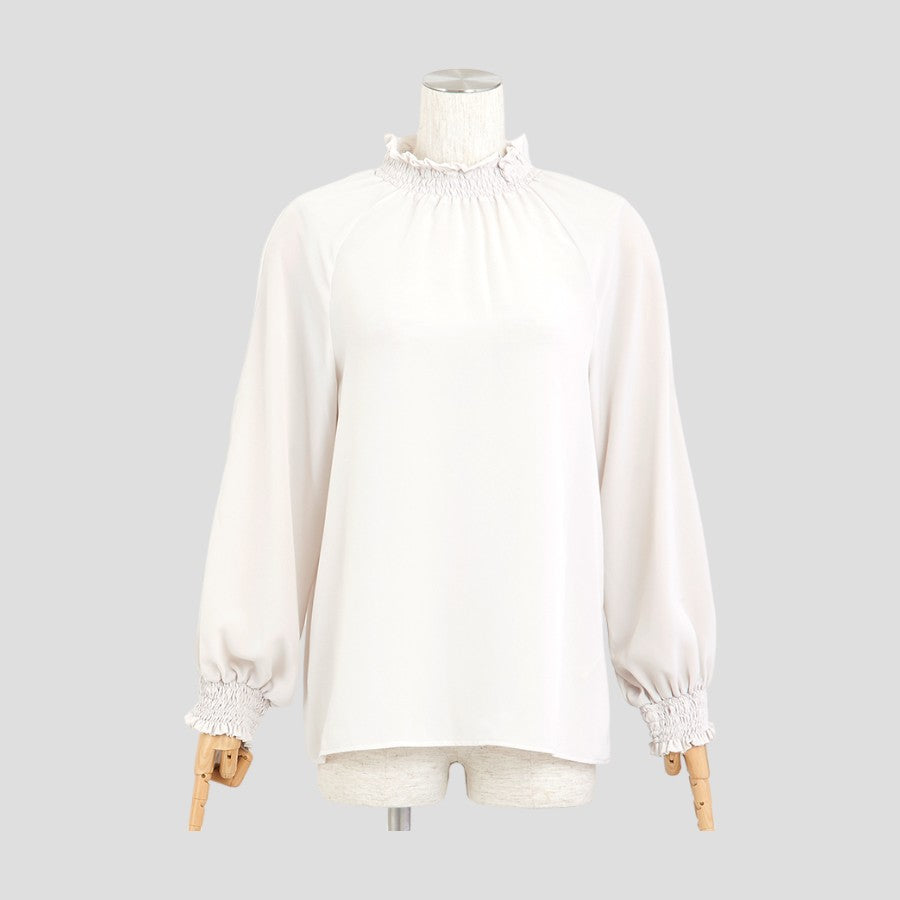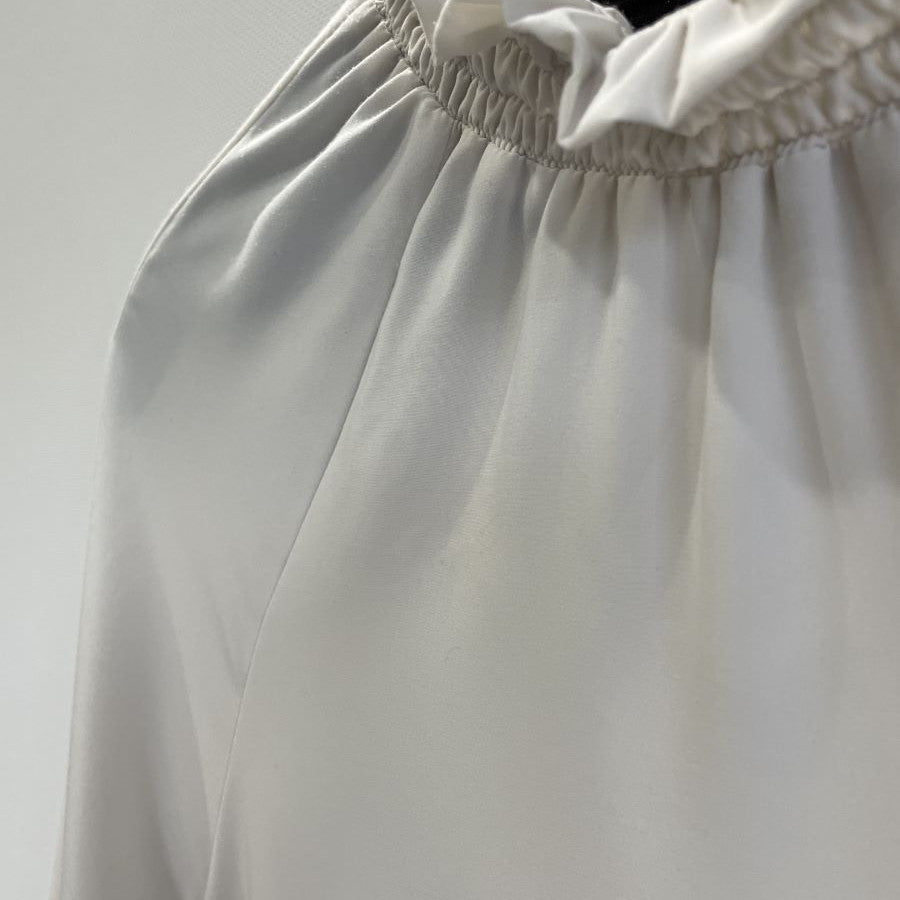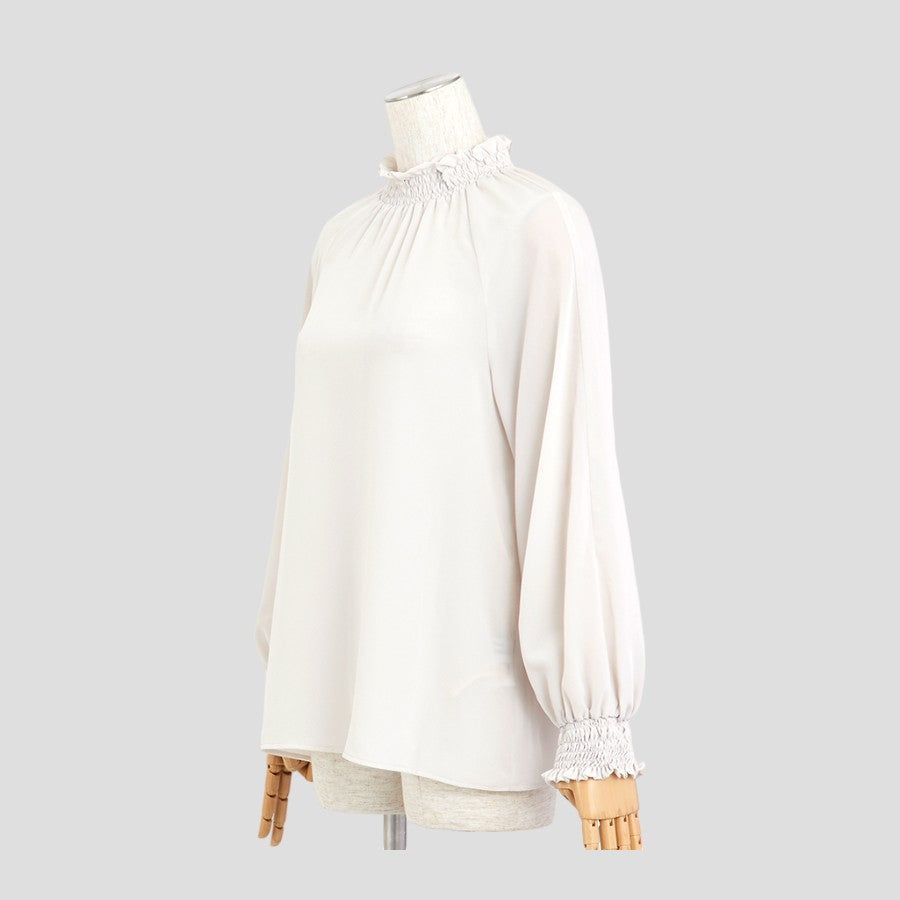 シャーリング仕立ての首元と袖口がアクセントになっています。