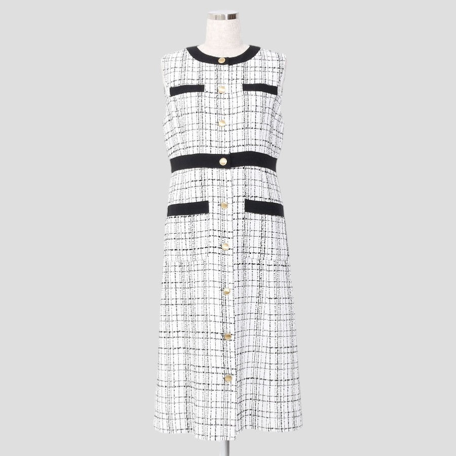 シンプルシルエットの金ボタンノースリーブワンピース。