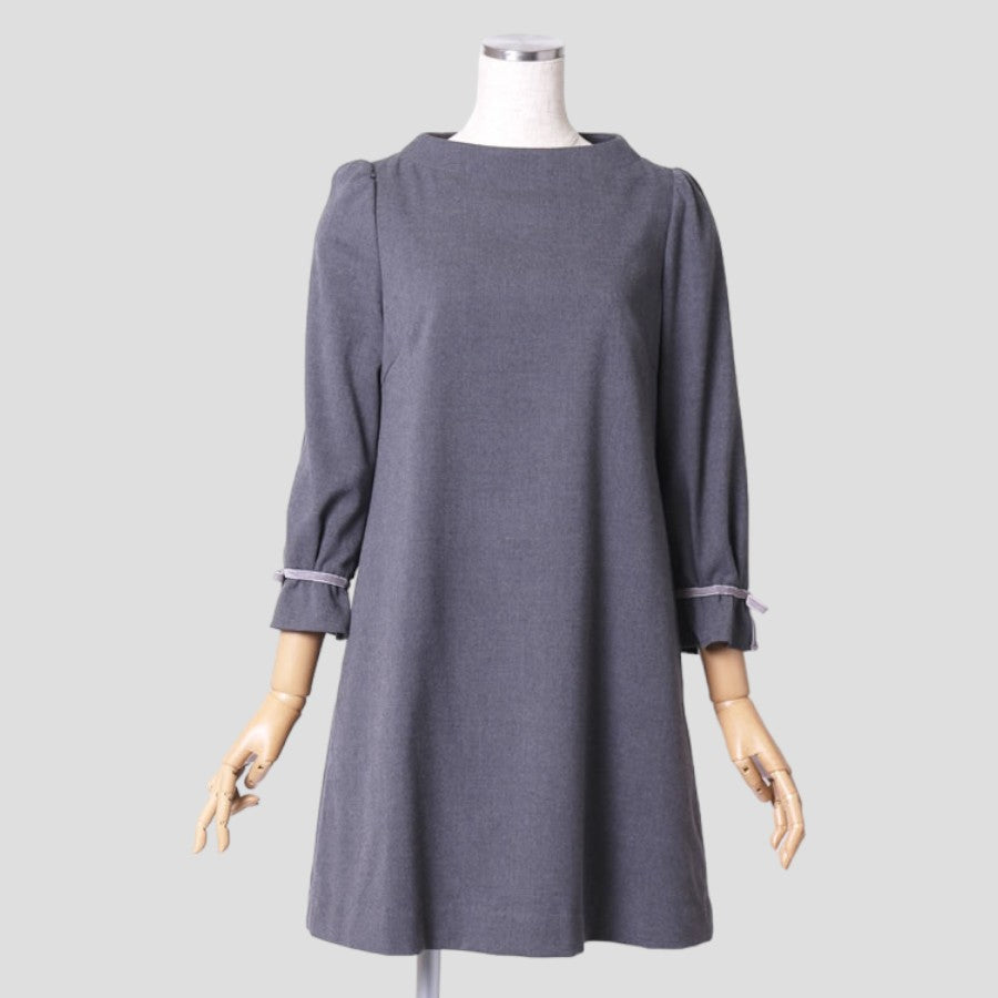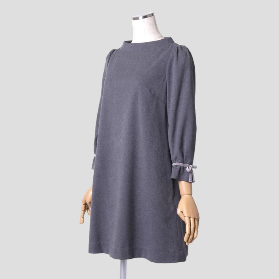 ボトルネックと袖口の飾りリボンがポイントのフレアワンピースです。