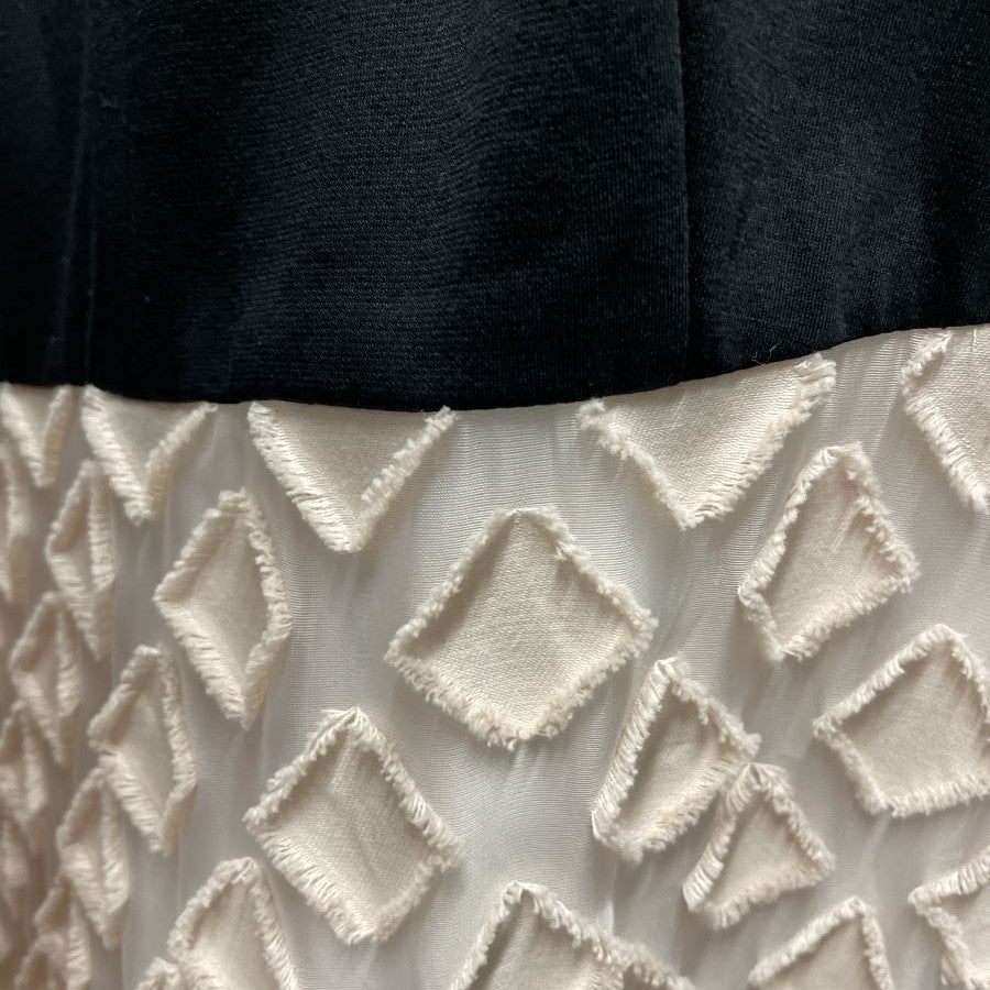 上身頃はポンチ素材で動きやすく、スカート部分はジャガード織と裾のシャンタン素材で上品に。