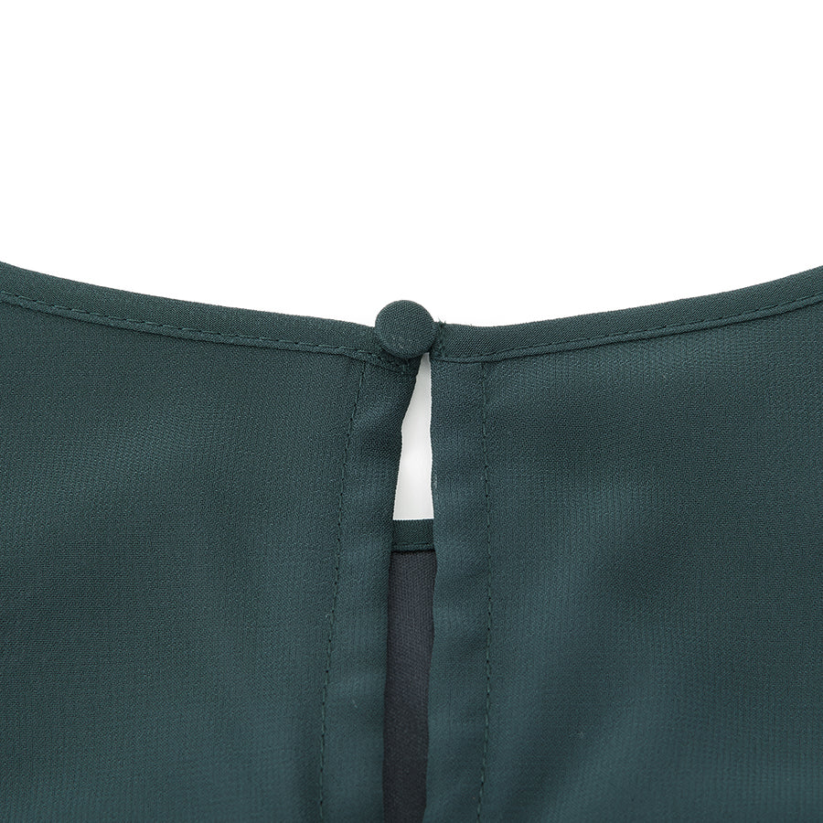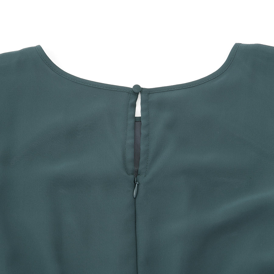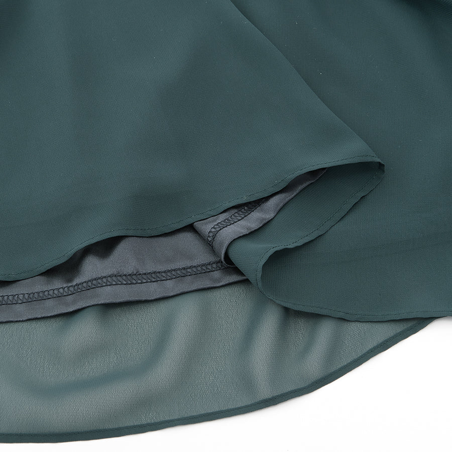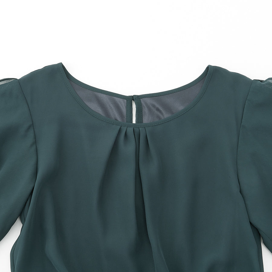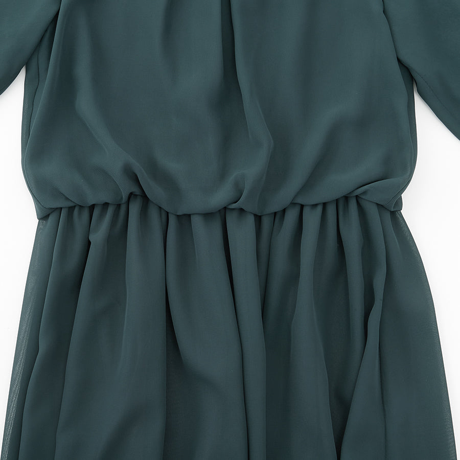シャーリングされたウエストから広がるシフォン素材のスカートが大人可愛い一着です。