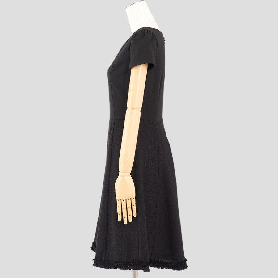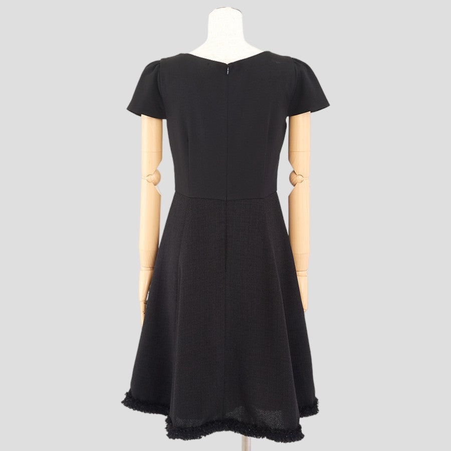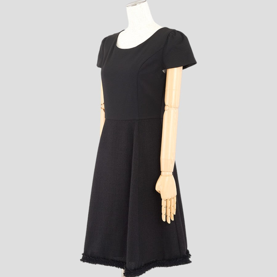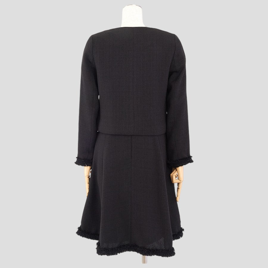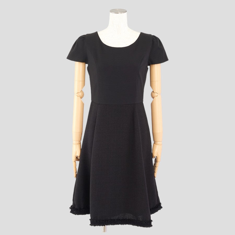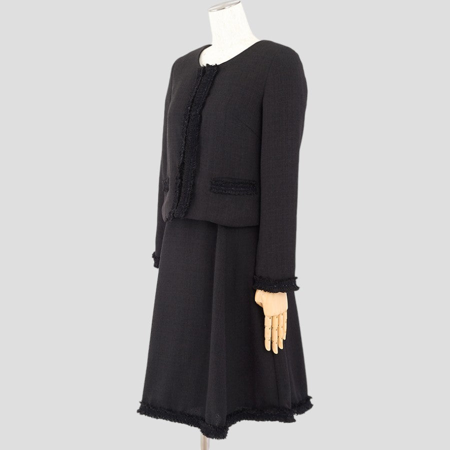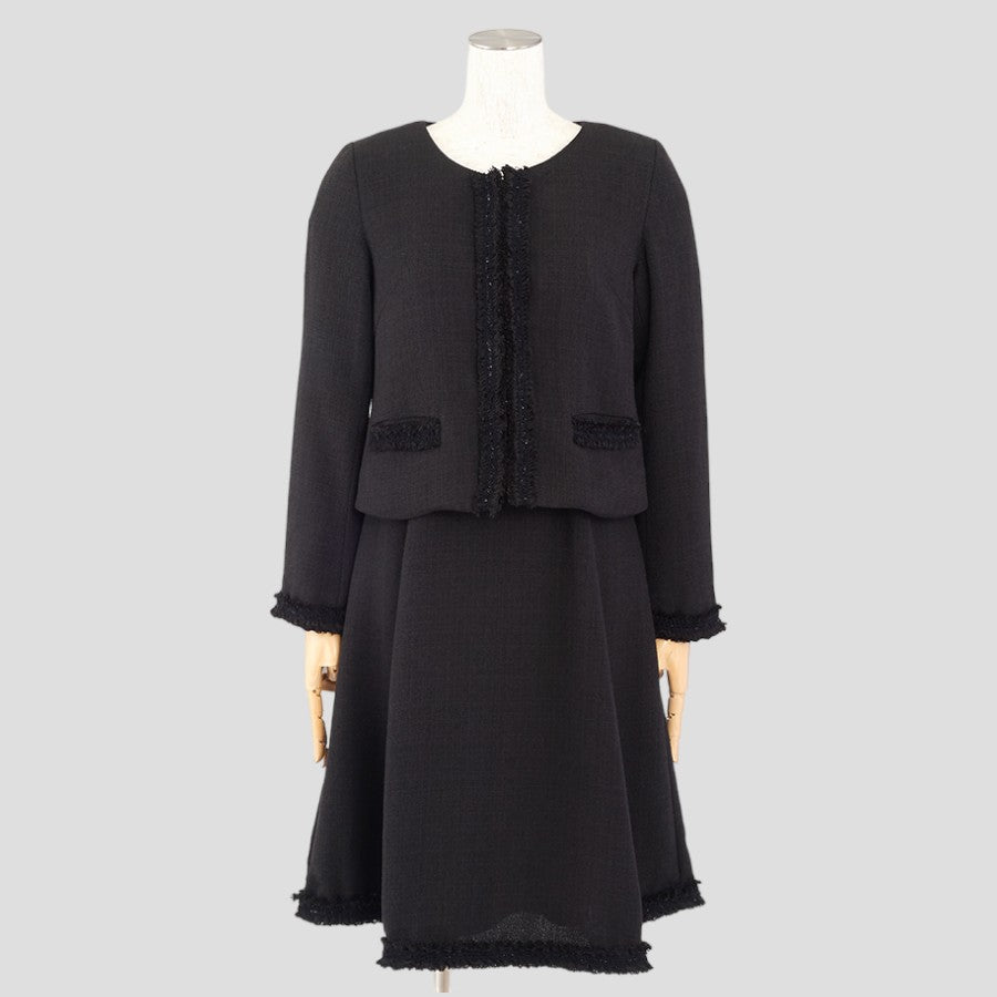 ツイード調のノーカラージャケットと異素材切替ワンピースのセットアップ。