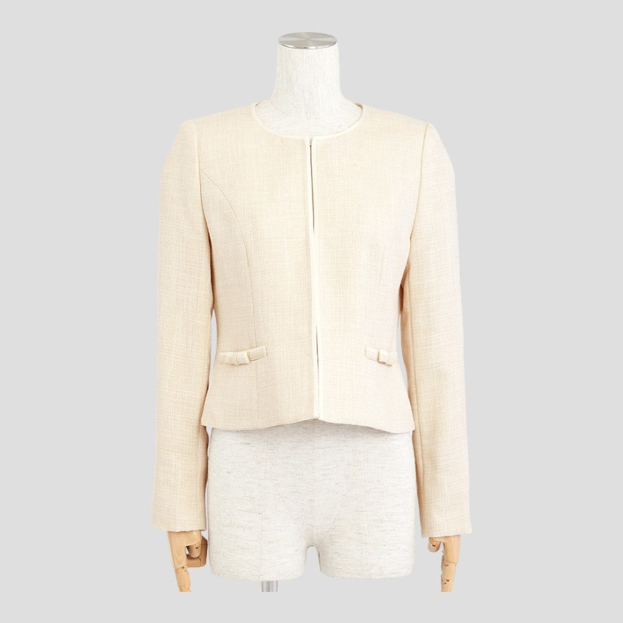 ラメ入りのツイード生地で作られたジャケットは、ポケット部分にリボンがついて大人可愛い1着となっています。